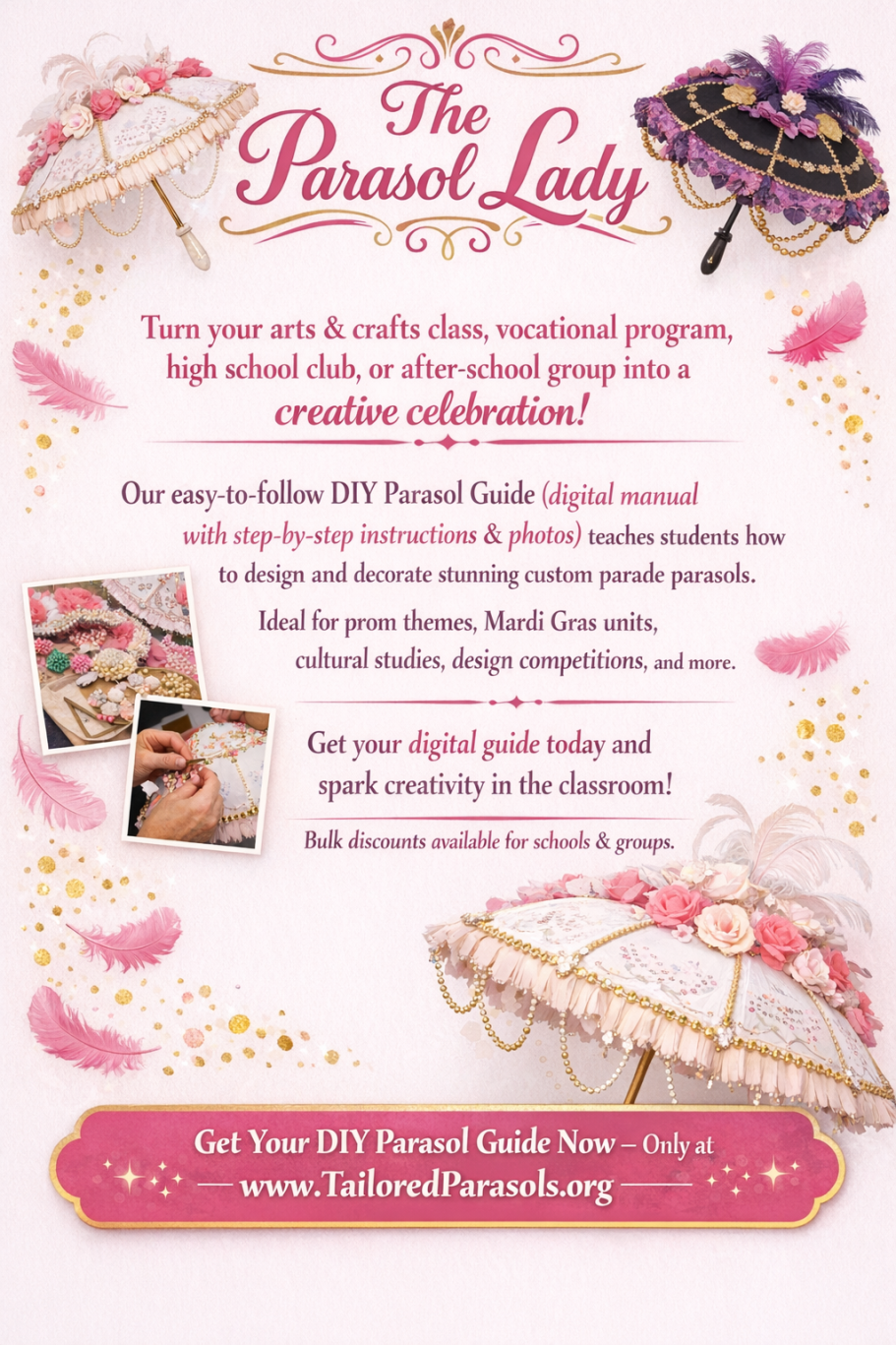 Discover beautifully handcrafted custom parasols designed for performance, celebration, and statement style. Our parasols are perfect for Mardi Gras umbrellas, dance teams, second lines, parades, weddings, festivals, and special events. Each parasol is thoughtfully designed with premium materials, vibrant fabrics, and eye-catching details such as fringe, sequins, lace, and custom color themes.