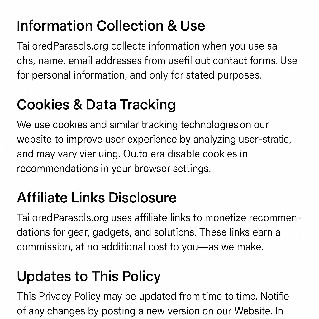 TailoredParasols.org (“we,” “our,” or “us”) respects your privacy and is committed to protecting it. This Privacy Policy explains how we collect, use, and safeguard your information when you visit our website.